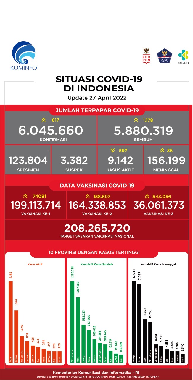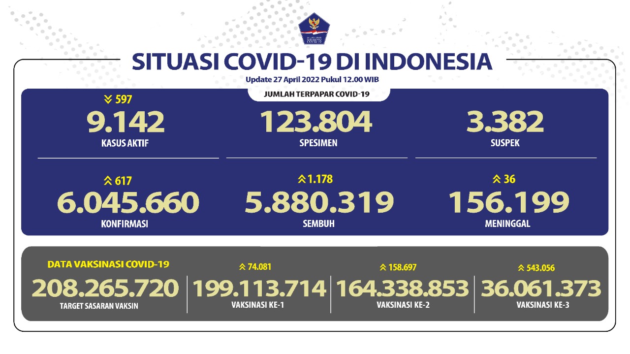 Jakarta, 50detik.com— Perkembangan penanganan pandemi COVID-19 per 27 April 2022 secara nasional, angka kesembuhan harian bertambah 1.178 orang terdiri 1.156 transmisi lokal dan 22 Pelaku Perjalanan Luar Negeri (PPLN). Sehingga angka kumulatifnya terus meningkat melebihi 5,8 juta orang sembuh atau tepatnya 5.880.319 orang (97,3%).
