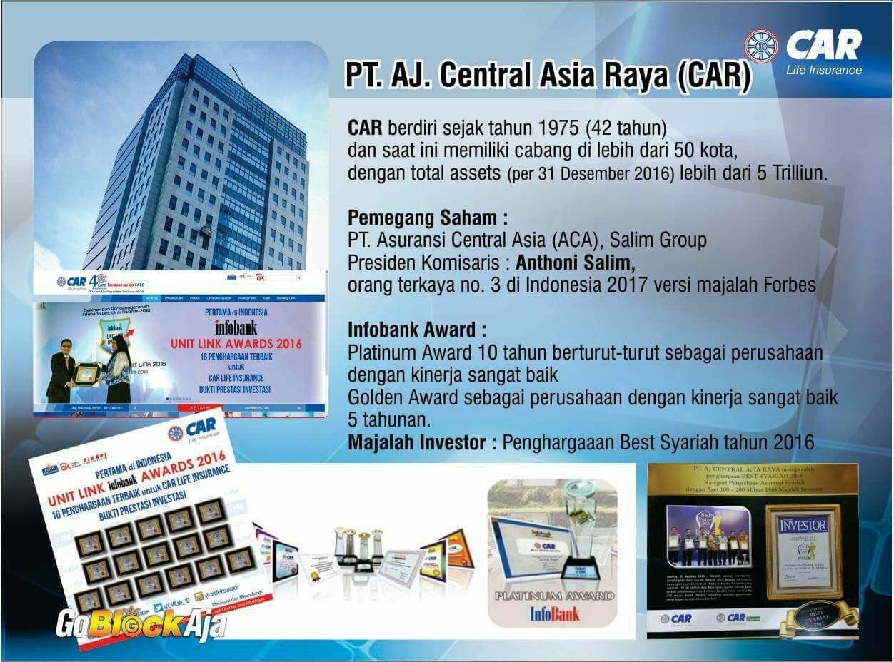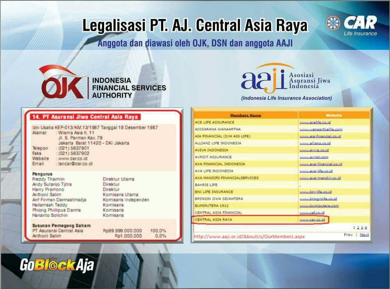 Jakarta, 50detik.com– PT AJ Central Asia Raya (CAR Life Insurance) didirikan tanggal 30 April 1975 berdasarkan Akta Notaris Ridwan Suselo no. 357, dengan modal Rp 500 juta dan disahkan dengan Surat Keputusan Menteri Kehakiman Republik Indonesia No.Y.A.5/450/6 Tanggal 9 Desember 1975. CAR pertama kali mendapat izin usaha berdasarkan Surat Keputusan Menteri Keuangan Republik Indonesia No.KEP.492/DJM/III-5/11/1975 Tanggal 15 November 1975. Setelah beberapa kali perpanjangan perijinan usaha, secara tetap dan tanpa batas Perusahaan mendapat izin usaha perasuransian dari Kementerian Keuangan R.I. Nomor: KEP-013/KM.13/1987, tanggal 18 Desember 1987.