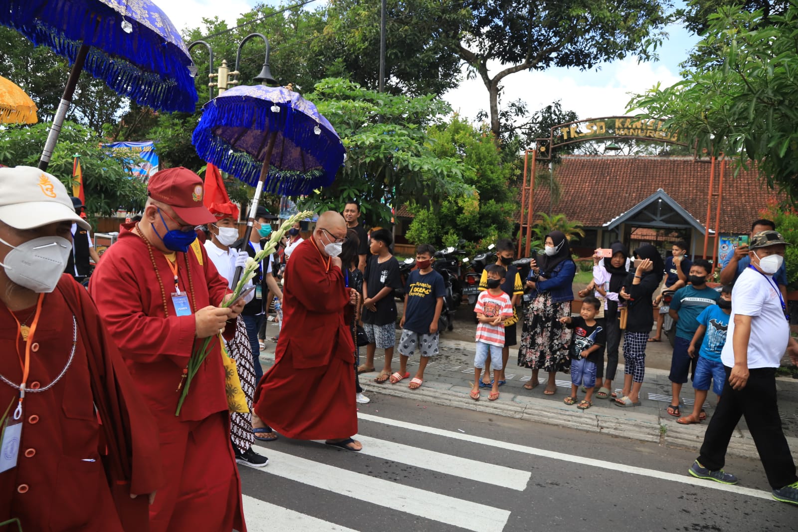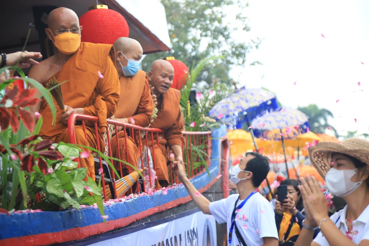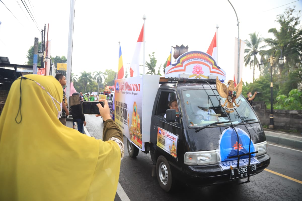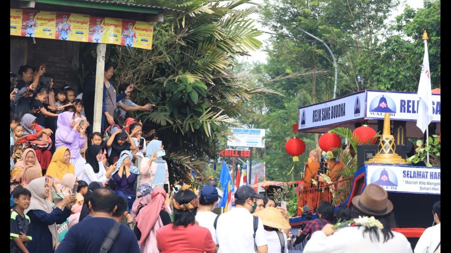 Perempuan berhijab tersebut tampak antusias melihat arak-arakan bersama tiga orang anaknya. “Kalau Waisak, di sini memang ramai, Mbak. Yang senang bukan hanya orang Buddha. Kemarin pun kami ikut merasakan dikirim paket sembako, banyak isinya. Alhamdulillah,” imbuhnya