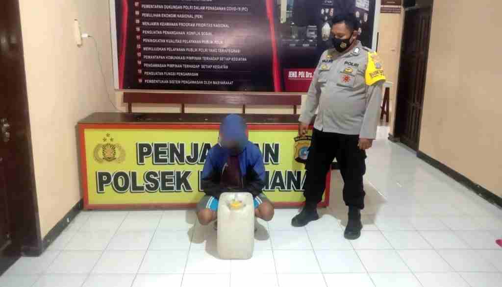 AH diciduk aparat ketika melintas di jalan Trans Assan-Pagimana Minggu(15/8/2021). Kini pria, sepeda motor dan barang bukti 20 liter Cap Tikus, diamankan di Mapolsek Pagimana, untuk proses hukum selanjutnya.