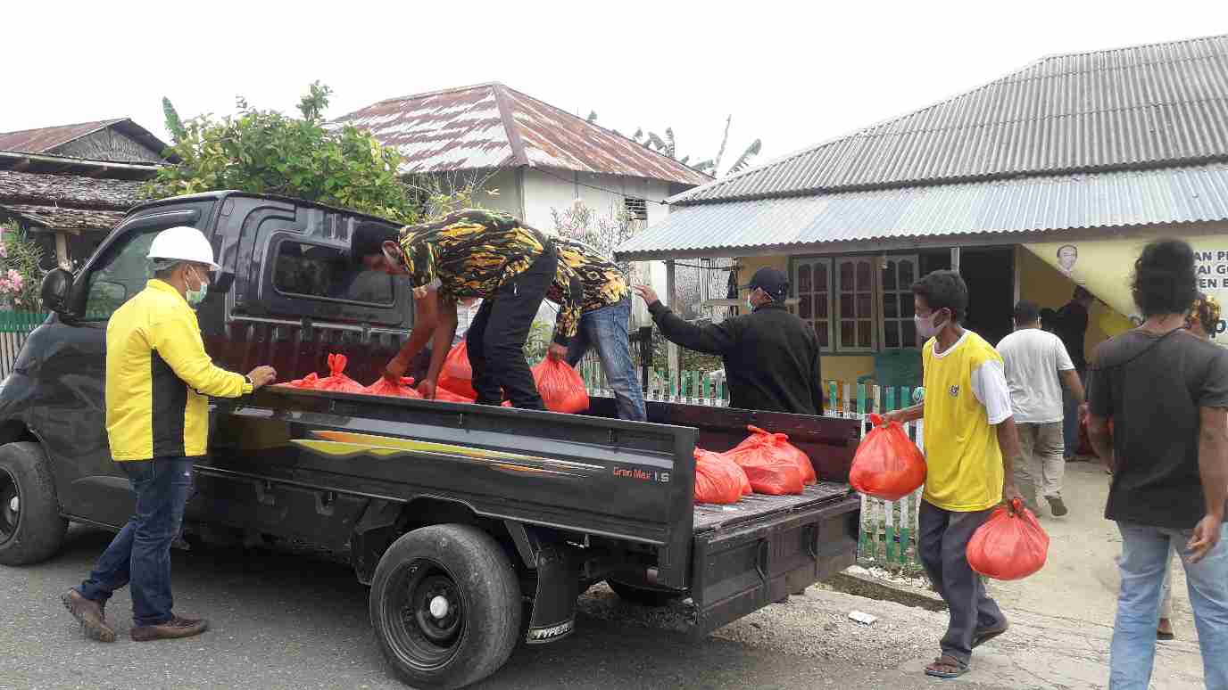 Risal Arwie, bersama ‘pasukan’ Angkatan Muda Partai Golkar (AMPG) Membagikan sembako itu secara langsung kepada warga Desa Abason dengan sistem pembagian door to door.