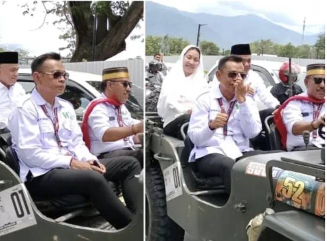 MENUJU KPU PALU:Pasangan bakal calon Walikota dan Wakil Walikota Palu, Hadianto Rasyid dan Imelda Liliana Muhidin menuju kantor KPU dengan menggunakan mobil Jeep Willys. (foto: metrosulteng.com)