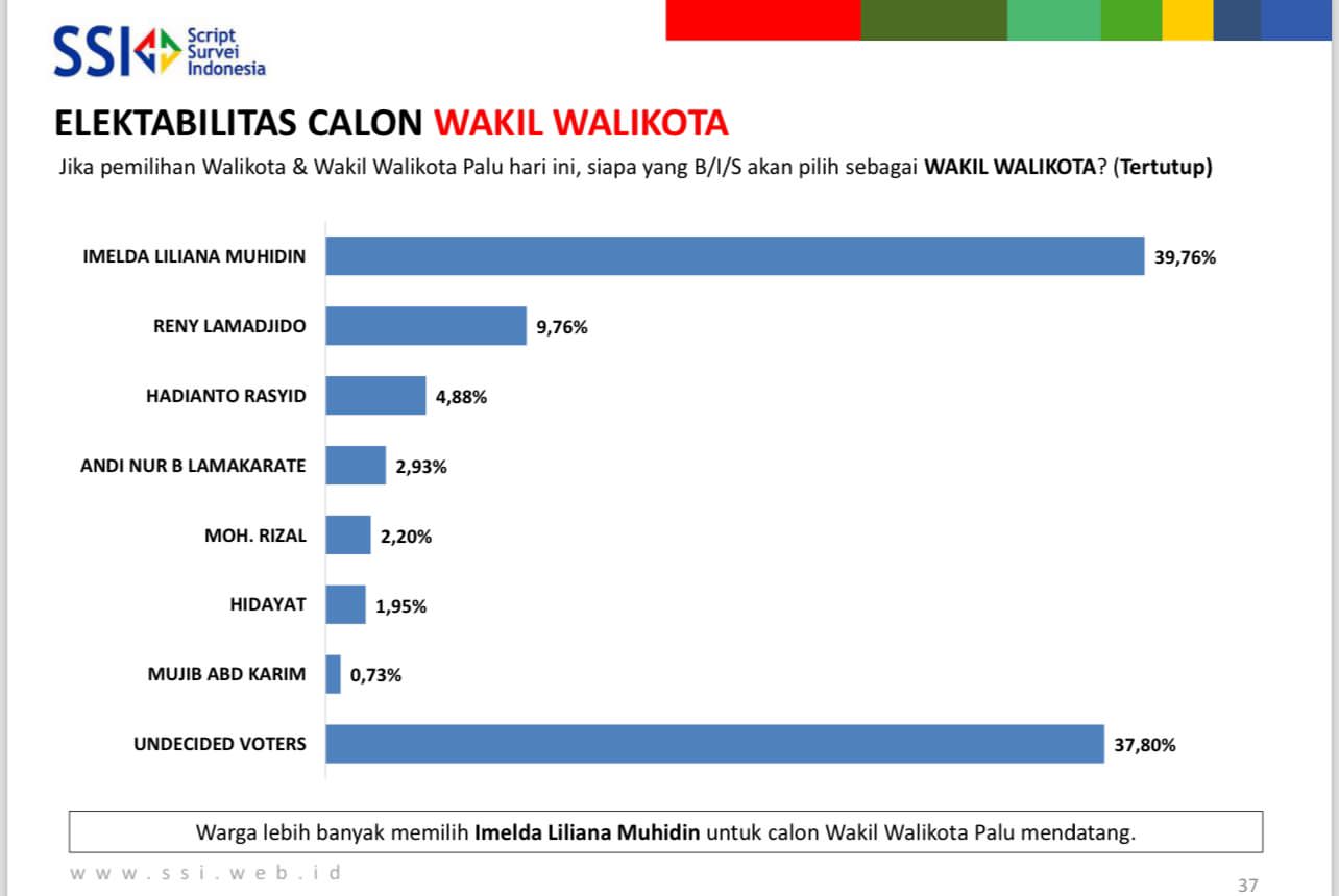 Sementara itu, hasil survei yang dirilis SSI  terkait tingkat elektabilitas calon Wakil Walikota Palu, menempatkan Imelda Liliana Muhidin mengungguli calon wakil walikota lainnya.