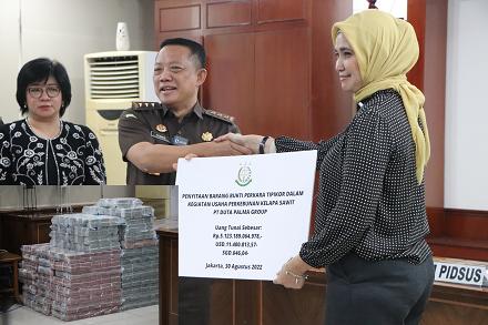 Jakarta, 50detik.com– Kejaksaan Agung (Kejagung) menyerahkan barang bukti uang senilai Rp 5,1 triliun dan 11 juta uang dollar amerika dan pecahan 646 dolar Singapura hasil eksekusi perkara kasus dugaan korupsi penyerobotan lahan sawit dengan tersangka Surya Darmadi (SD) kepada kas negara melalui Bank milik Pemerintah.