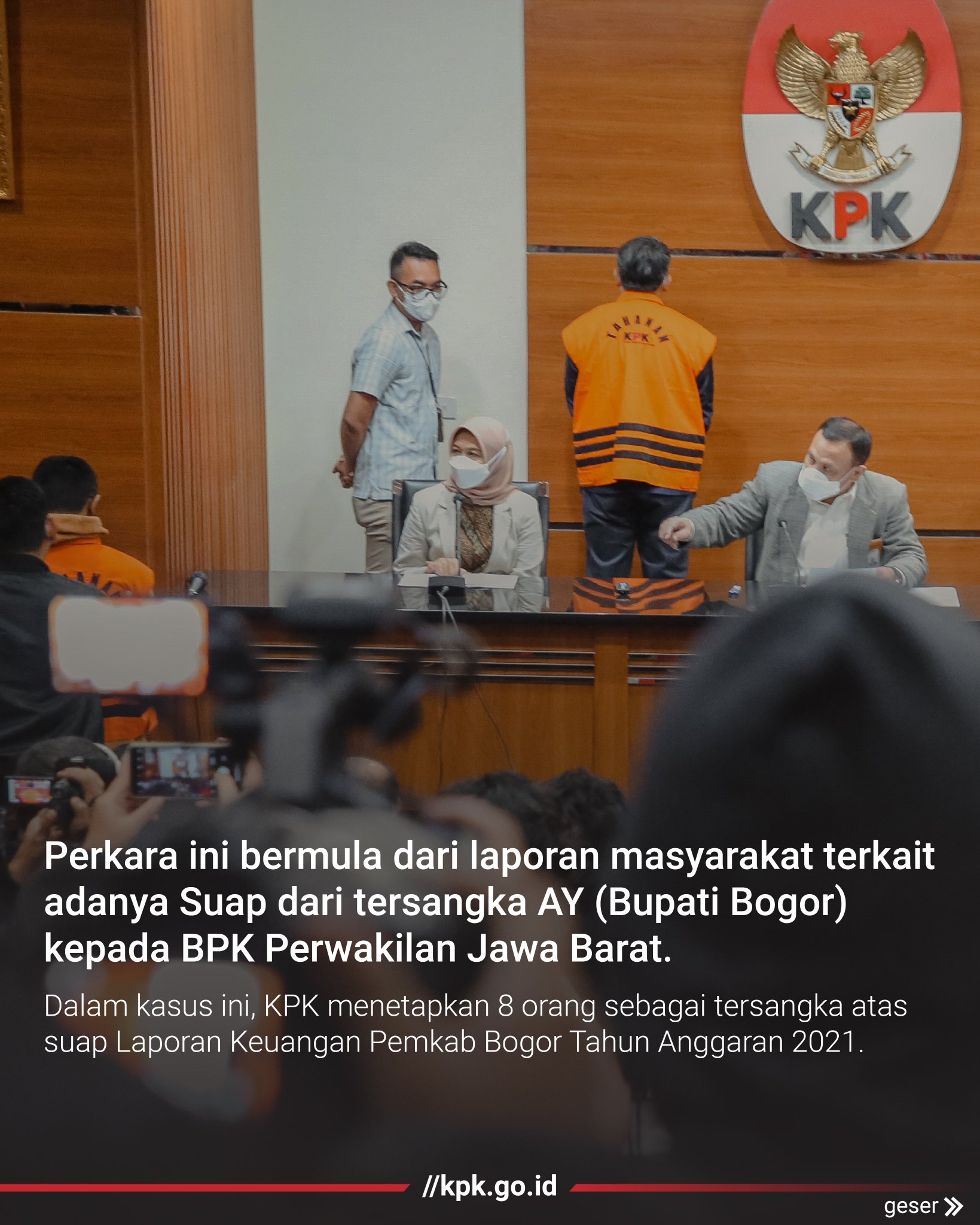 Perkara ini bermula dari laporan Masyarakat terkait adanya suap dari tersangka AY, (Bupati Bogor) kepada BPK perwakilan Jabar. KPK menetapkan 8 orang sebagai tersangka yaitu AY, ATM, AM, HNRK, GGTR, MA, IA, RT.