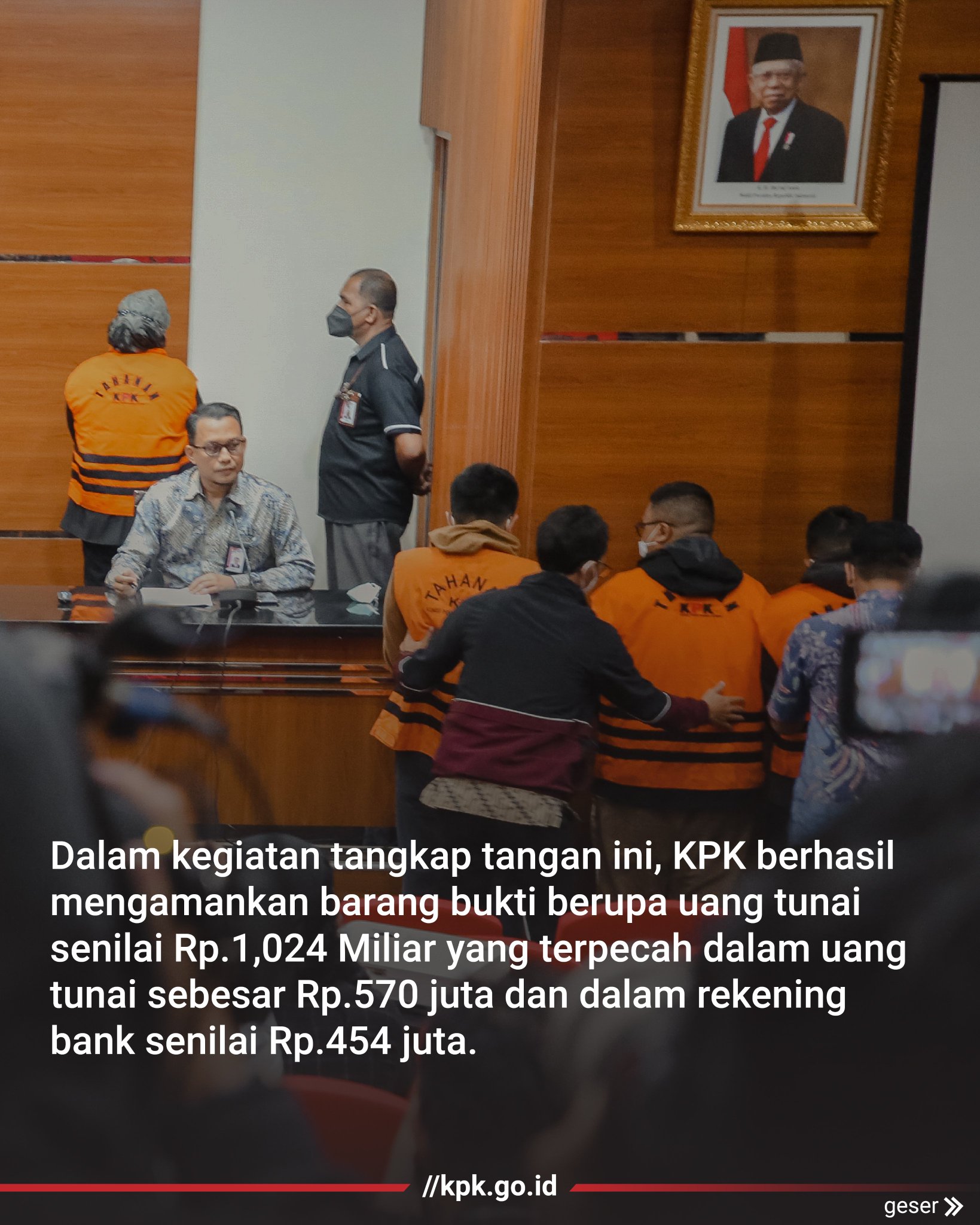 KPK mengamankan barang bukti berupa uang dalam pecahan rupiah dengan total Rp1,024 Miliar. Terdiri dari uang tunai sebesar Rp570 juta dan uang pada rekening bank sejumlah sekitar Rp454 juta. (3/5)