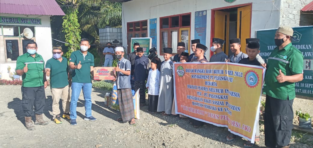 Mewakili Administratur (ADM) PT Pasangkayu Gunawan, CDO Ofier Paath mengatakan, hari buruh atau May Day tahun bertepatan dengan Hari Raya Idul Fitri, sehingga kami manejemen PT Pasangkayu bersepakat dengan SPSI PUK PT Pasangkayu menggelar baksos dengan menyerahkan paket sembako Ponpes Abu Huraerah.