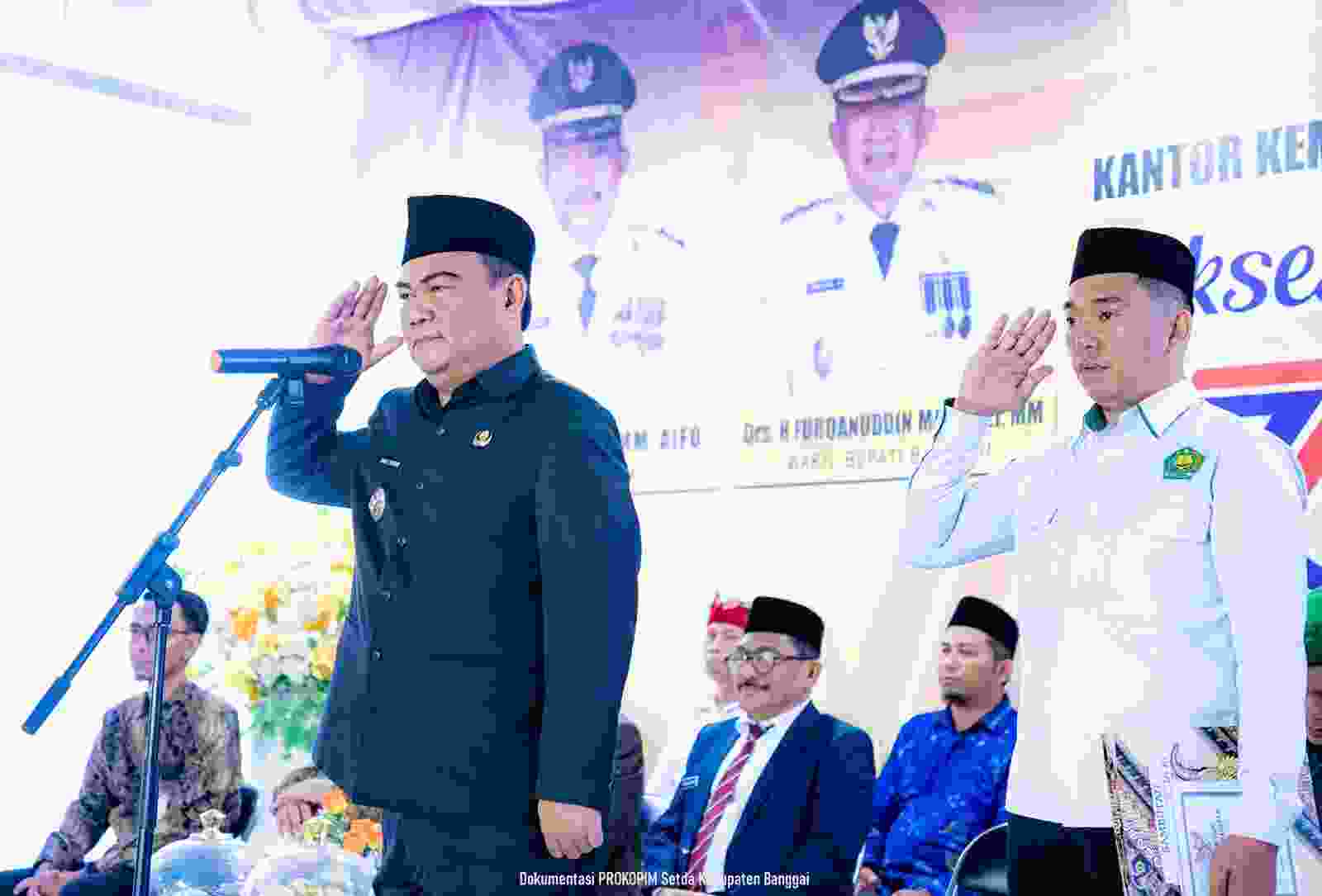 Turut hadir Unsur Forkopimda, Kepala Kemenag Kab. Banggai, Kepala Baznas Kab. Banggai, Direktur Bank BSI, para Pejabat Lingkup Kemenag Banggai, para KUA se-Kabupaten Banggai, para Dewan Guru Lingkup Kemenag Banggai, dan Seluruh peserta upacara.