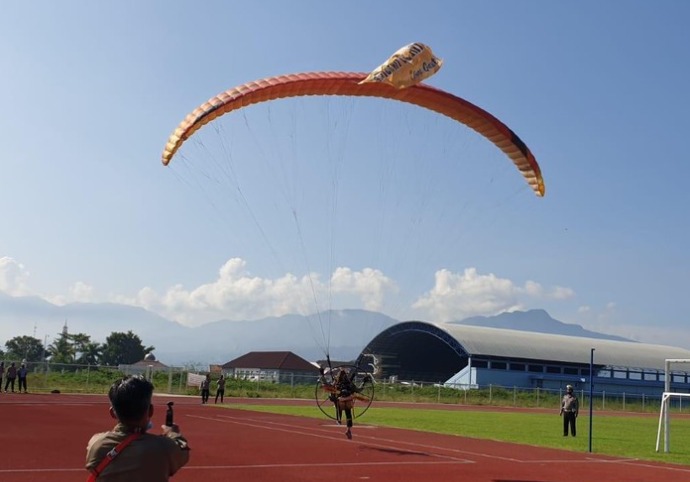 Kapolres Garut AKBP Wirdhanto Hadicaksono, S.I.K., M.Si., menyiapkan tiga anggotanya untuk terbang menggunakan paralayang dan paramotor. Mereka akan memandu dan memberikan imbauan kepada para pemudik yang melaksanakan arus balik.