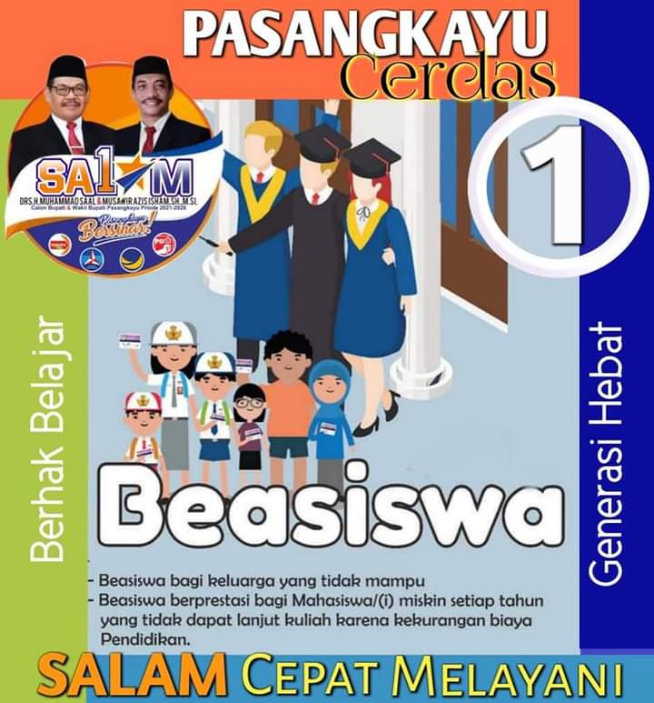 Pasangkayu,50detik.com – Apalagi yang anda ragukan tentang kepemimpiban pasangan SALAM (Drs H Muhammad Saal – Musawir Azis Isham, SH, MSi) kandidat calon bupati – calon wakil bupati Pasangkayu periode 2021-2026, dimana keduanya berkomitmen untuk prioritaskan pemberian bea siswa bagi anak-anak Pasangkayu yang melanjutkan studi di daerah manapun.