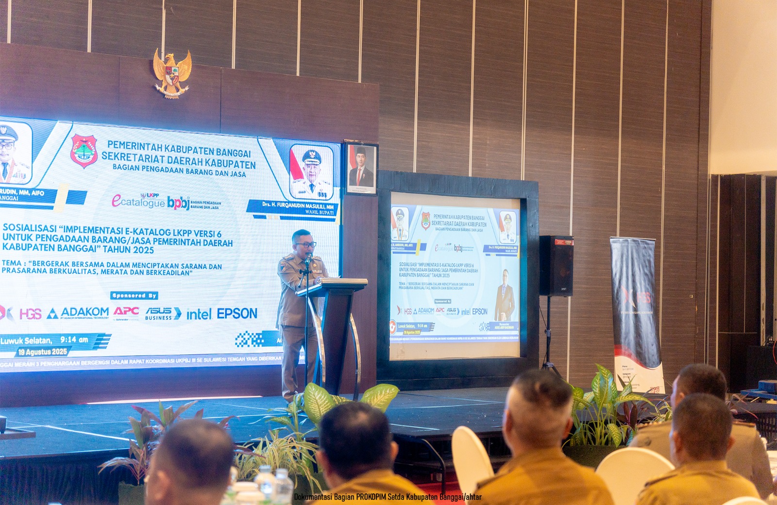 Bupati Banggai Ir. H. Amirudin, M.M., AIFO bersama Wakil Bupati Banggai Drs. H. Furqanuddin Masulili menghadiri kegiatan Sosialisasi Implementasi E-Katalog LKPP Versi 6 Untuk Pengadaan Barang/Jasa Pemerintah Daerah Kabupaten Banggai Tahun 2025, bertempat di Ballroom Estrella Hotel Kelurahan Tanjung Tuwis, Kecamatan Luwuk Selatan, pada Selasa (19/8/2025).