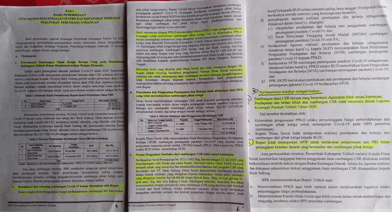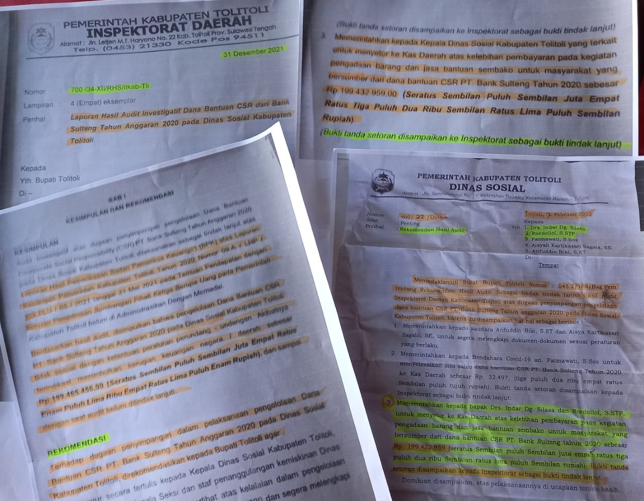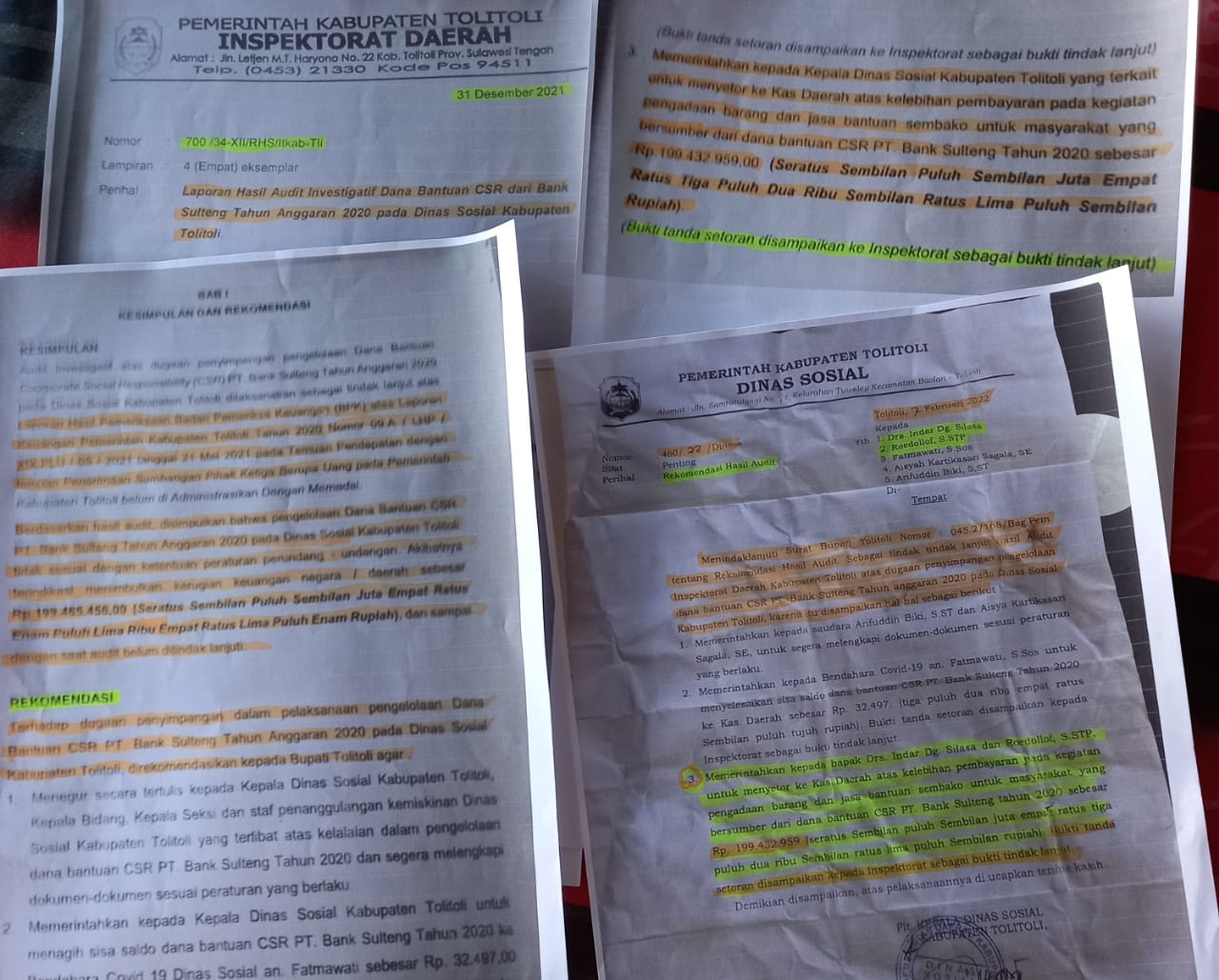 yang dilakukan oleh Inspektorat atau Aparat pengawas Internal Pemerintah Kabupaten tolitoli tanggal 31 Desember 2021.. telah disampaikan kepada Bupati tolitoli disimpulkan bahwa pengelolaan dana bantuan CSR PT Bank Sulteng tahun 2020 pada dinas sosial Kabupaten tolitoli tidak sesuai dengan peraturan perundangan undangan akibatnya terindikasi menimbulkan kerugian keuangan negara sebesar Rp.199.465.456 dan sampai dengan saat ini audit belum ditindak lanjuti