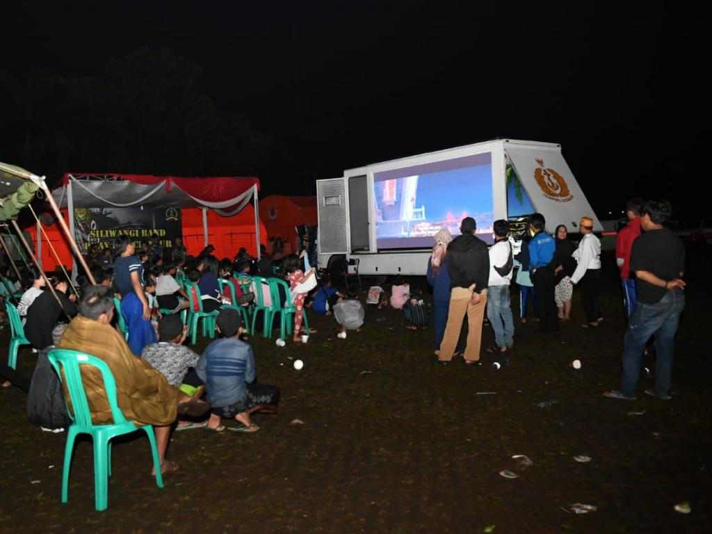 Dengan memanfaatkan fasilitas Smart Truck Dinas Penerangan Angkatan Laut (Dispenal), para prajurit menghibur dengan menampilkan tayangan bagi anak-anak hingga nonton Piala Dunia di pengungsian Lapangan Joglo, Kabupaten Cianjur, Sabtu (26/11).